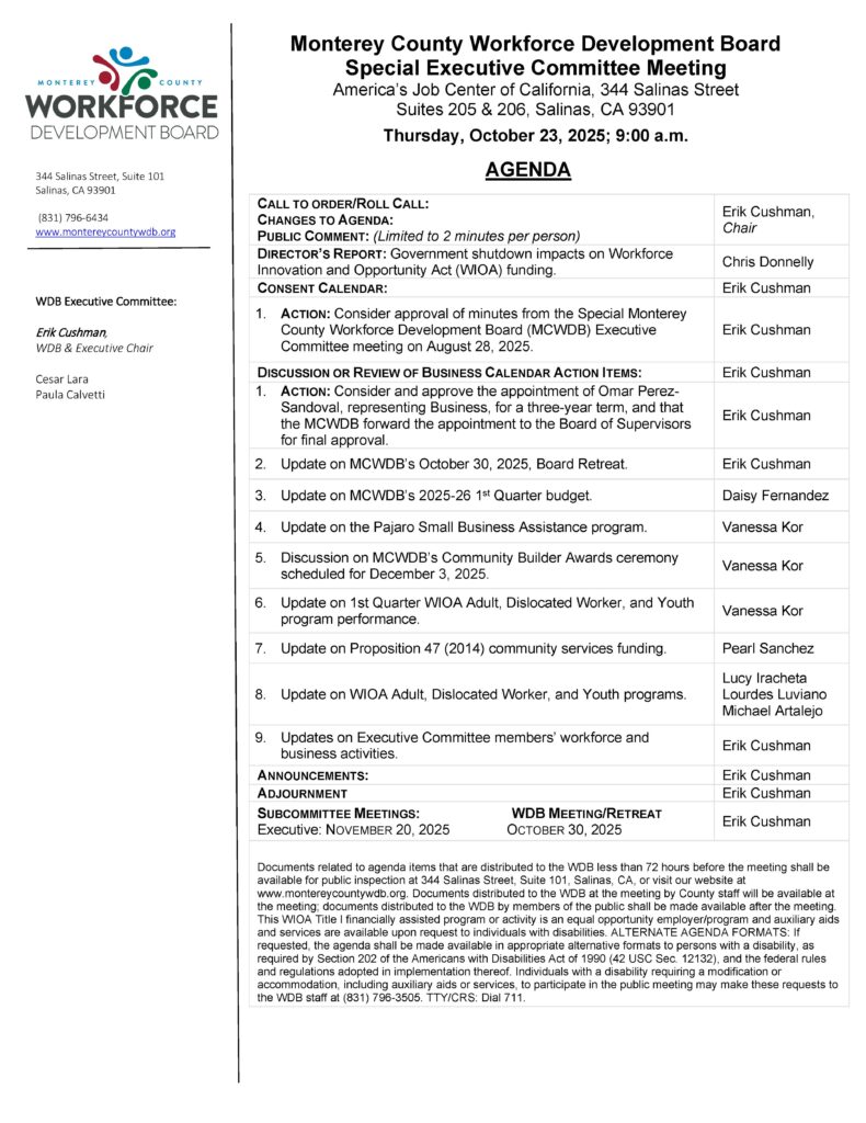MCWDB Special Executive Committee Meeting + Add to Google Calendar + iCal / Outlook export Date Oct 23 2025 Expired! Time 9:00 am - 11:00 am Location Monterey County Works Center Category Board or Committee MeetingsOnsite Events Organizer Monterey County Workforce Development Board