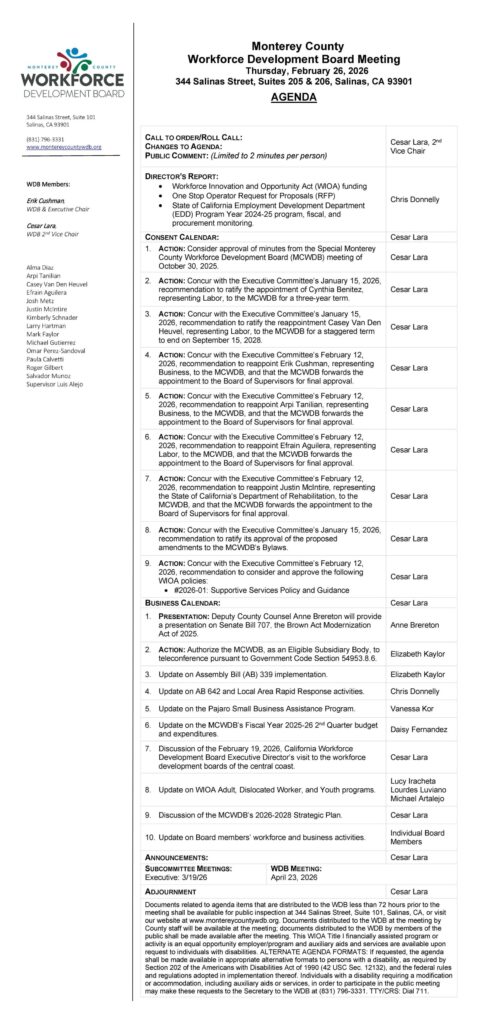 Monterey County Workforce Development Board Meeting Download the meeting packet HERE. + Add to Google Calendar + iCal / Outlook export Date Feb 26 2026 Expired! Time 9:00 am - 11:00 am Location Monterey County Works Center Category Board or Committee MeetingsOnsite Events Organizer Monterey County Workforce Development Board