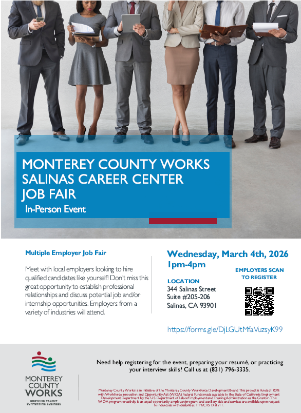 Multiple Employer Job Fair Registered Employers To Date + Add to Google Calendar + iCal / Outlook export Date Mar 04 2026 Expired! Time 1:00 pm - 4:00 pm More Info Employers Register Here Location Monterey County Works Center - Salinas 344 Salinas Street, Salinas CA Category Employer EventsJob FairsJob Seeker EventsOnsite Events