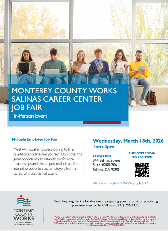 Multiple Employer Job Fair Registered Employers To Date + Add to Google Calendar + iCal / Outlook export 00 days 00 hours 00 minutes 00 seconds Date Mar 18 2026 Time 1:00 pm - 4:00 pm More Info Employers Register Here Location Monterey County Works Center - Salinas 344 Salinas Street, Salinas CA Category Employer EventsJob FairsJob Seeker EventsOnsite Events Employers Register Here